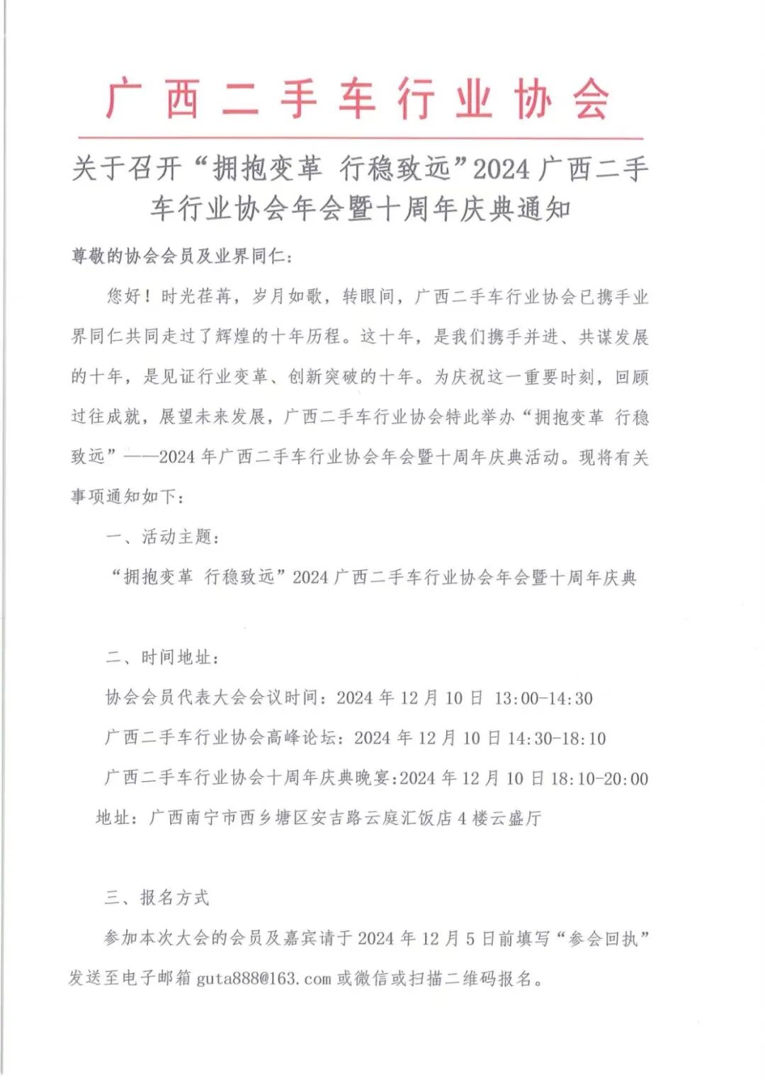 协会资讯|2024广西二手车行业协会年会暨十周年庆典定于12月10日在南宁举行