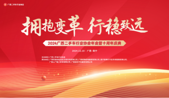 时光荏苒,岁月如歌,转眼间,广西二手车行业协会已携手业界同仁共同走过了辉煌的十年历程。这十年,是我们携手并进、共谋发展的十年,是见证行业变革、创新突破的十年。为庆祝这一重要时刻,回顾过往成就,展望未来发展,广西二手车行业协会特此于12月10日在南宁举办“拥抱变革 行稳致远”——2024广西二手车行业协会年会暨十周年庆典活动。