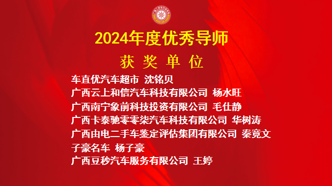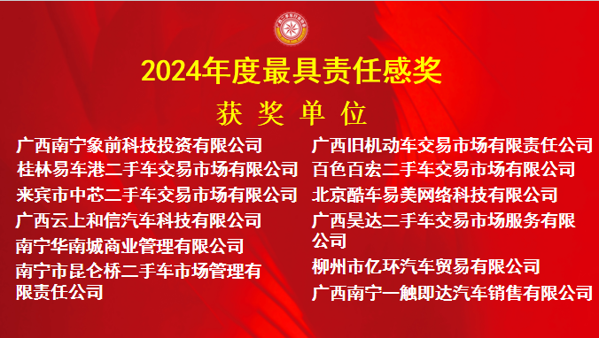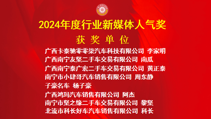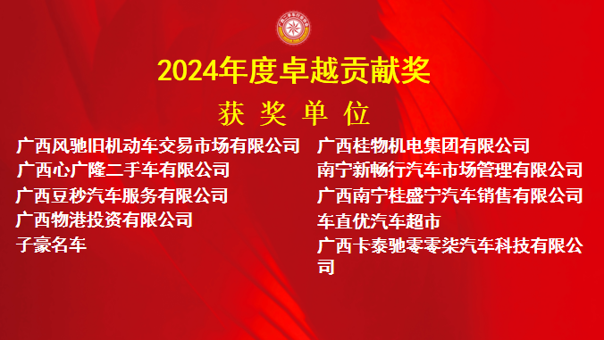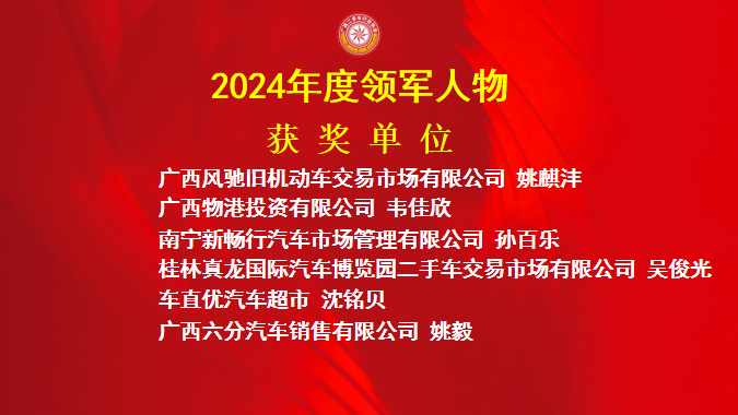 在“2024年度广西二手车行业协会”颁奖仪式中,表彰了一批在二手车行业中表现突出的行业精英。他们在各自的领域内取得了显著成绩,为推动全广西二手车行业的健康发展做出了积极贡献。